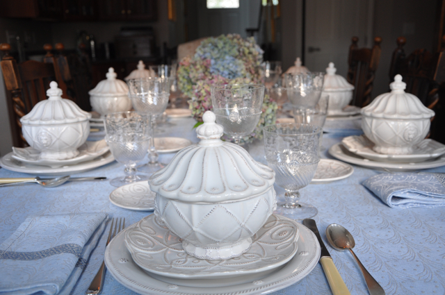 There are also countless options for serving it. Cream soup cups and saucers for small portions of cream-rich bisques or clear consommes. Rimmed soup plates, deep bowls or handled bowls for heartier, denser soups that readily retain their heat. Then there is the individual tureen, a personal favourite. Juliska offers a very reasonably priced option with their Jardins du Monde pattern. It is the ultimate in casual chic, as shown here with the matching salad and canape plates. The goblets and water glasses are Graham, also by Juliska. The linens are from a small shop in Pienza, Italy.