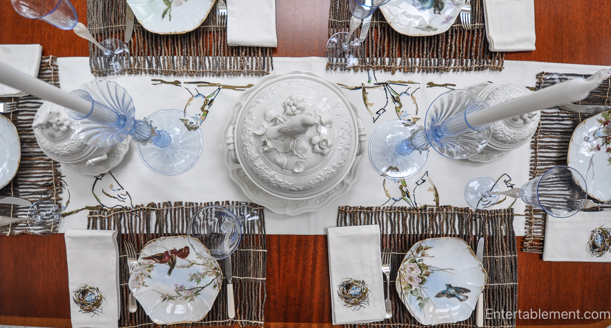 The linens came from Pottery Barn a couple of years ago. The runner features very pretty stylized birds, and the napkins are embroidered with a nest containing pale blue eggs. French blue antique Venetian goblets and modern Venetian candlesticks coordinate perfectly.
