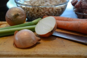 - The onions, carrots & celery along with the soaked beans