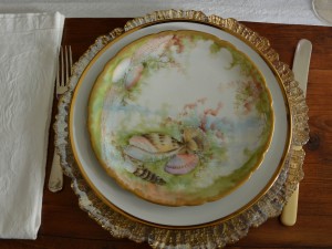 The “crustacean plates” were from Wisteria Antiques in Brewster, Cape Cod. The gold & white dinner plates and the chargers are modern, from Pier One.