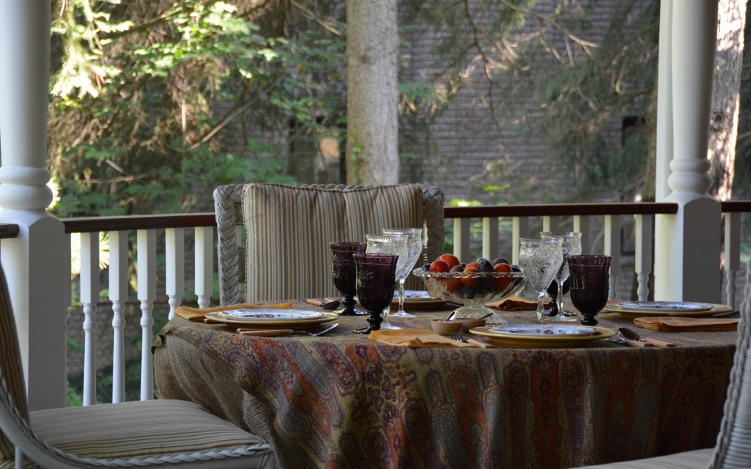 Scanning my linen cupboard for inspiration, the plummy shades in this paisley throw jumped out at me, and immediately thought of the purple Juliska glasses both I and my daughter Kirsten have in our collections. Mine are in the Cape so I borrowed hers and paired them with some clear Webb wheel-cut antique goblets from Elise Abrams Antiques.