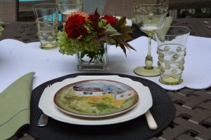 The dinner plates are Country Heritage from Villeroy and Boch (the pattern is discontinued, but can be obtained from Replacements from time to time. The goblets are Graham and the tumblers are Isabella both by Juliska (the green colour is discontinued, but you can still get Graham and Isabella in clear). The napkins are linen hemstitched, also from Pottery Barn and come in various colours.