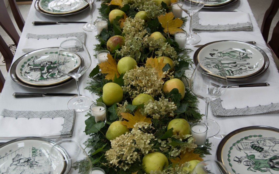 I started out with cedar boughs, ivy, green apples and pears, but it still looked a bit dull, as you can see above. I consulted Mary Plumstead, my cohort in tableware crime, and she suggested layering in some gold leaves to add depth. Bingo. Dried Annabelle hydrangea and votive candles provided another layer of interest and the arrangement was complete.