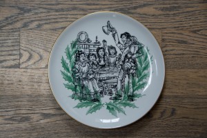 These creative pursuits apparently extend to tableware, I was excited to discover. Shenango, primarily a manufacturer of restaurant ware, produced this series of twelve plates between 1952 to 1963 for advertising purposes – one plate per year.