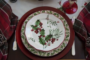 The holly runner, red caterer’s chargers and plaid napkins are Pottery Barn from several years ago.