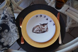 Once in a while, I come across a set of plates that just makes me laugh, and Casa Moda’s Paw Prints fit the bill. An e-Bay find, they popped up one day when I was looking for something else. I was only able to snag one set of four, but after I set this table I went online again and found another set, so now we have eight. A good thing, as I have five granddaughters and four plates would never have done. As it is, we’ll have inevitable arguments about favourites!