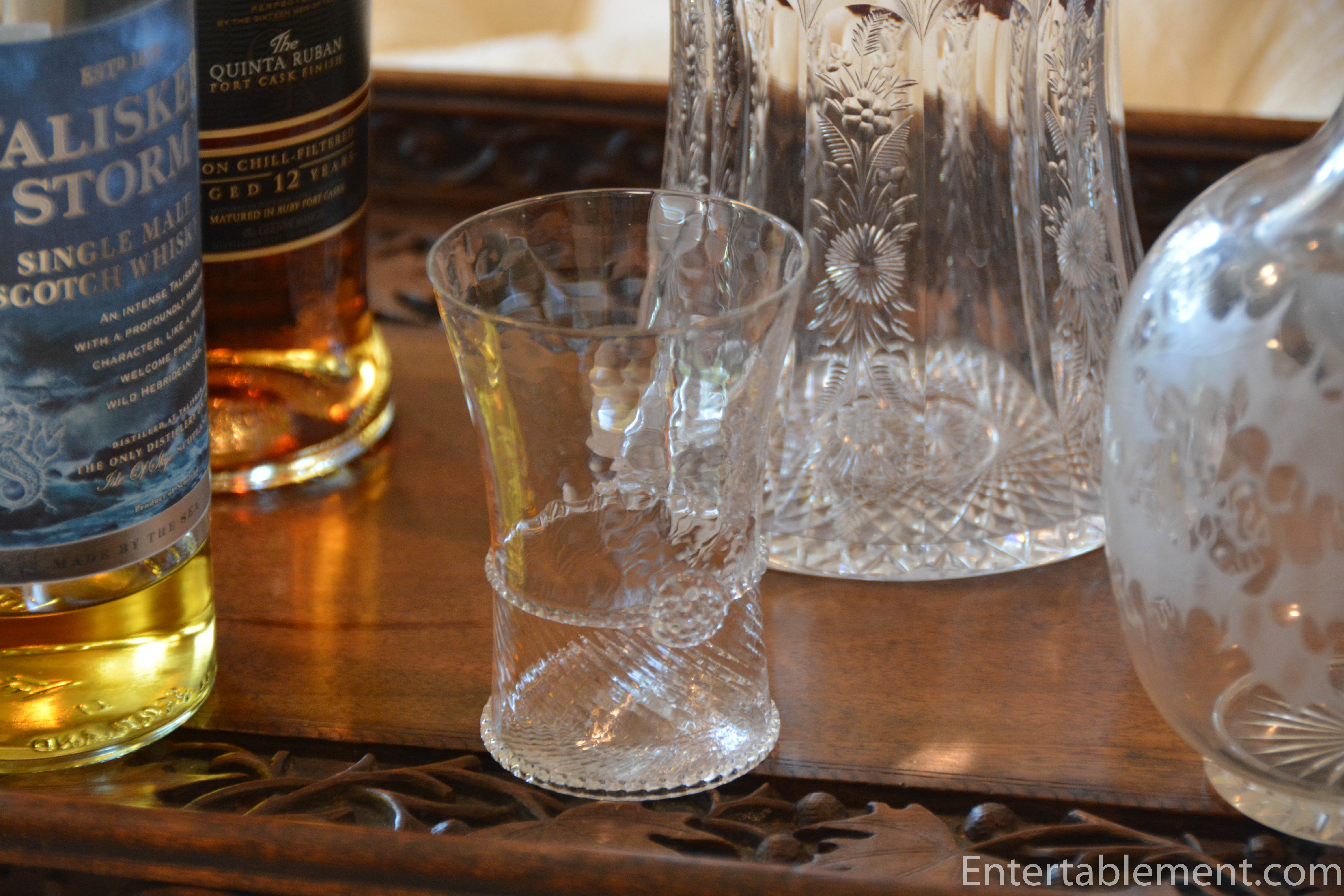 Vintage Whiskey Glasses – for sipping whiskey with a splash of water. These are actually juice glasses in the Buttercup pattern by Fostoria. Replacements is an excellent source for elegant Depression Glass. Search for juice glasses and narrow your choices to Cambridge, Fostoria and Tiffin-Franciscan. The creamer in the same pattern makes a great add-on, as it can be used for the touch of water.