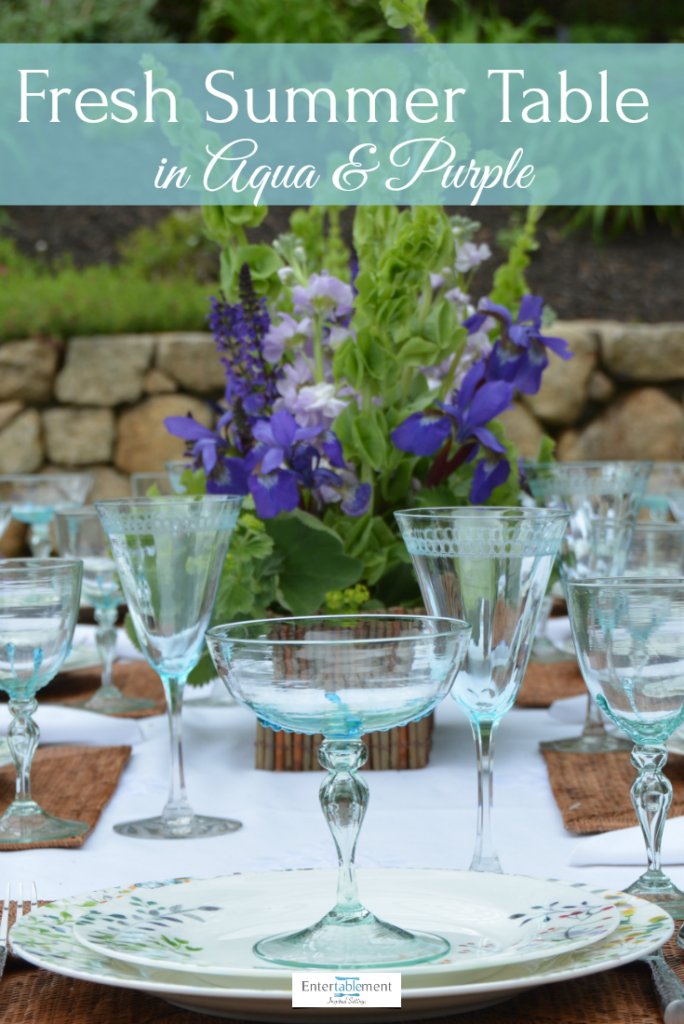 I used a combination of my turquoise needle-etched Venetian water glasses and turquoise ribbed Venetian glass wine glasses and compotes, all from Elise Abrams Antiques.