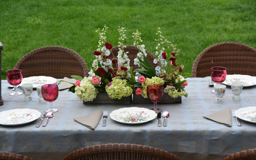 I was delighted to find a bunch at Trader Joe’s this spring, and eagerly took them home to incorporate in a flower arrangement. I remembered that Spode Romney featured similarly pale blue flowers, and used that bouquet as inspiration for the centerpiece.