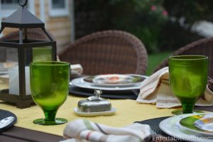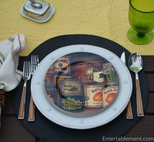 The vintage feel of the tins on the plates is very fun. Beautiful yard for outdoor dining.