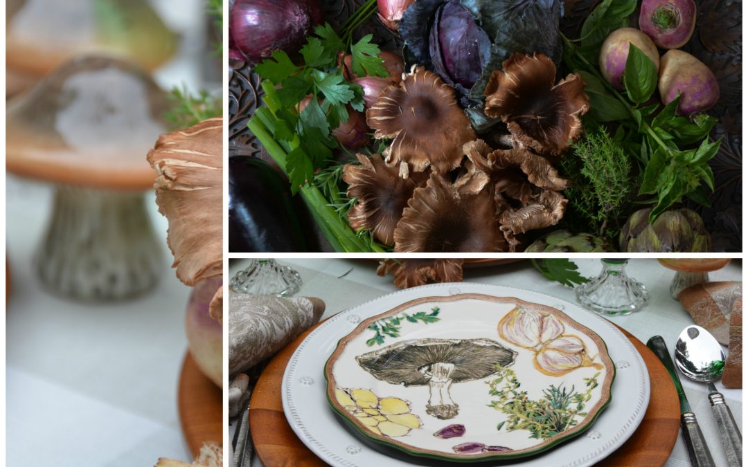 The plates are from several years ago, and feature a variety of vegetables and herbs typically found in a French Market: aubergine, shallots, red onions, scallions, artichokes, red cabbage, garlic, thyme, rosemary, parsley, and of course, mushrooms.