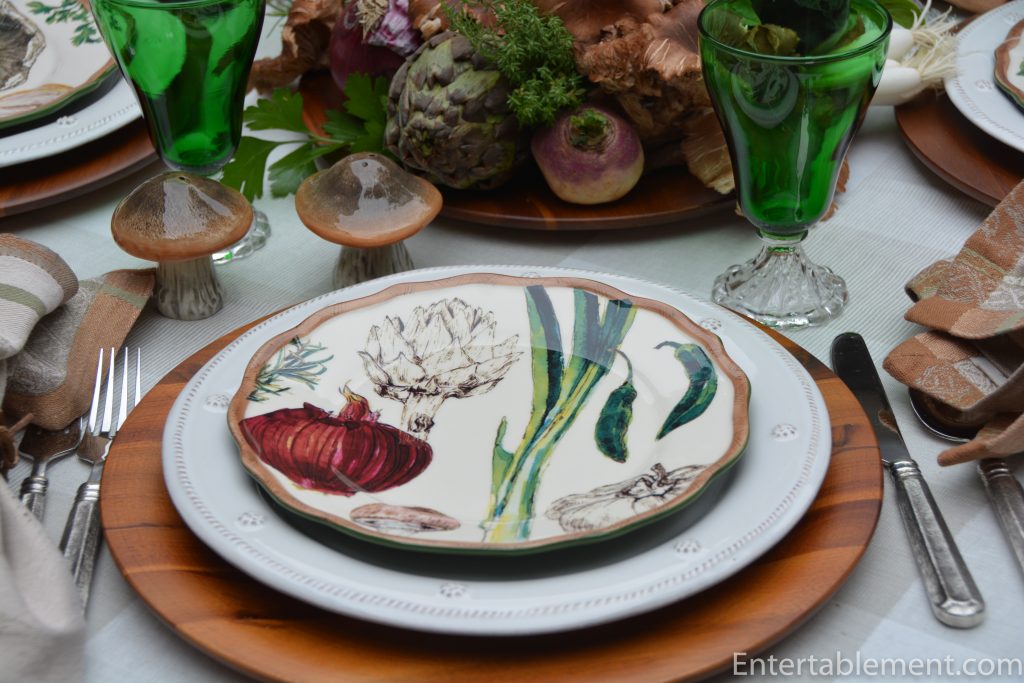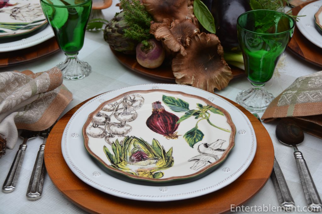 Each plate focuses on a different vegetable, yet the pattern is very cohesive, with a softly scalloped edge in taupe. I used Whitewash Berry & Thread dinner plates from Juliska, which has a similar taupe undertone. The wooden chargers are from Amazon.com.