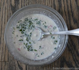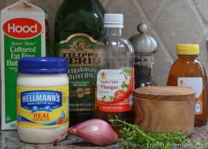 The vinaigrette dressing is a creamy combination of buttermilk, mayonnaise, apple cider vinegar, shallots and fresh herbs. The recipe called for a whopping two cups, which I found excessive and cut back to one cup – still more than enough for us, but feel free to double up if you’re a true dressing fan.