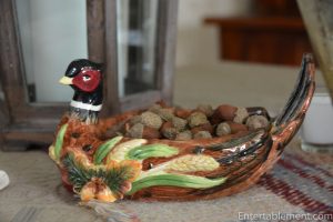 Who could resist those little pheasant faces? The guy on the left is described as a gravy boat, but functions well as a small tureen. I filled the candy dish with small acorns, and they look quite at home nestled there.