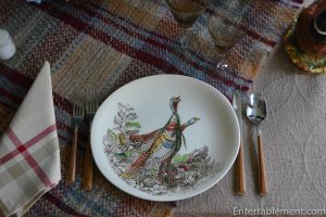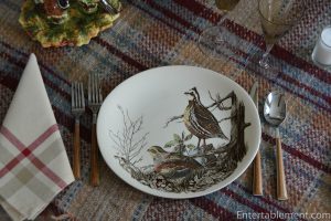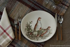 The pattern plays well with others, too. The tureen is Brookshire, also by Johnson Brothers. I had a lot of fun putting this table together with all the birds, tartans and heathery bits.