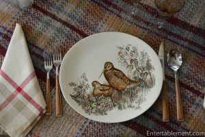 I love these plates! I think my favorite is the quail, not because it’s the prettiest plate but because of my childhood memories of my grandparents, who loved quail and taught me to call them with their “bob-white” whistle. The birds would actually answer, which of course thrilled a child like me. Thank you for sharing this pretty table, it brought back wonderful memories!