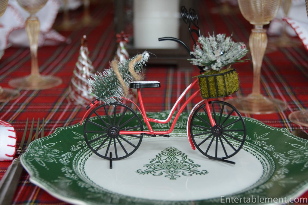 These bicycles are actually picture holders, but I thought they’d work well as place card holders. The details are delightful, including a moss-filled basket of greenery on the handlebars and a tree strapped on the back fender.