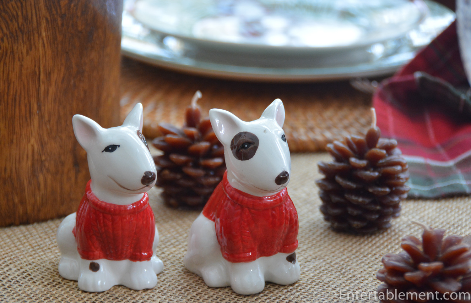 Tartan napkins from Pottery Barn a few years ago and festive napkin rings from Pier 1 echoed the tartan trim on the plate and the greenery and pinecone backdrop to the dogs.