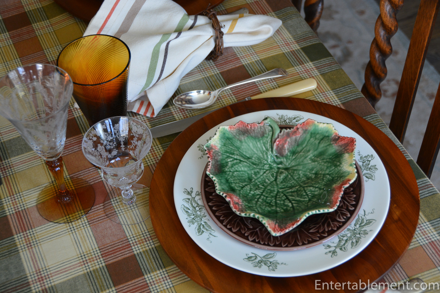 I was going to use these leaf-shaped Bordhallo Pinheiro plates (an e-Bay find) for the tart, but went with the vintage brown Majolica oak leaf plates, instead (also from eBay).