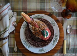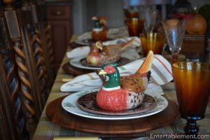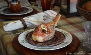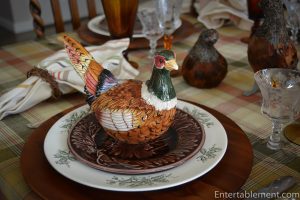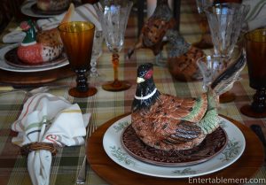 I have a variety of different bird-themed individual soup tureens, which were a big hit. They are a combination of Fitz & Floyd Game Bird male and female trinket boxes and pheasant tureens, and the ducks are part of the Spode Harvest Figural collection. I got them from eBay and Replacements.