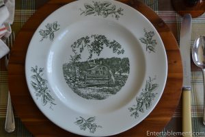 I used the Thomas Long Wedgwood green transferware plates with scenes of New England for the dinner plates.