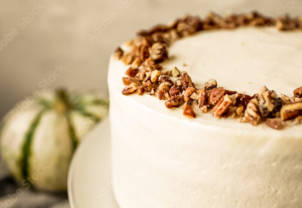 Delicately moist pumpkin cake surrounded by luscious brown-butter cream cheese frosting, topped with spicy crystallized ginger, pepitas and pecans.