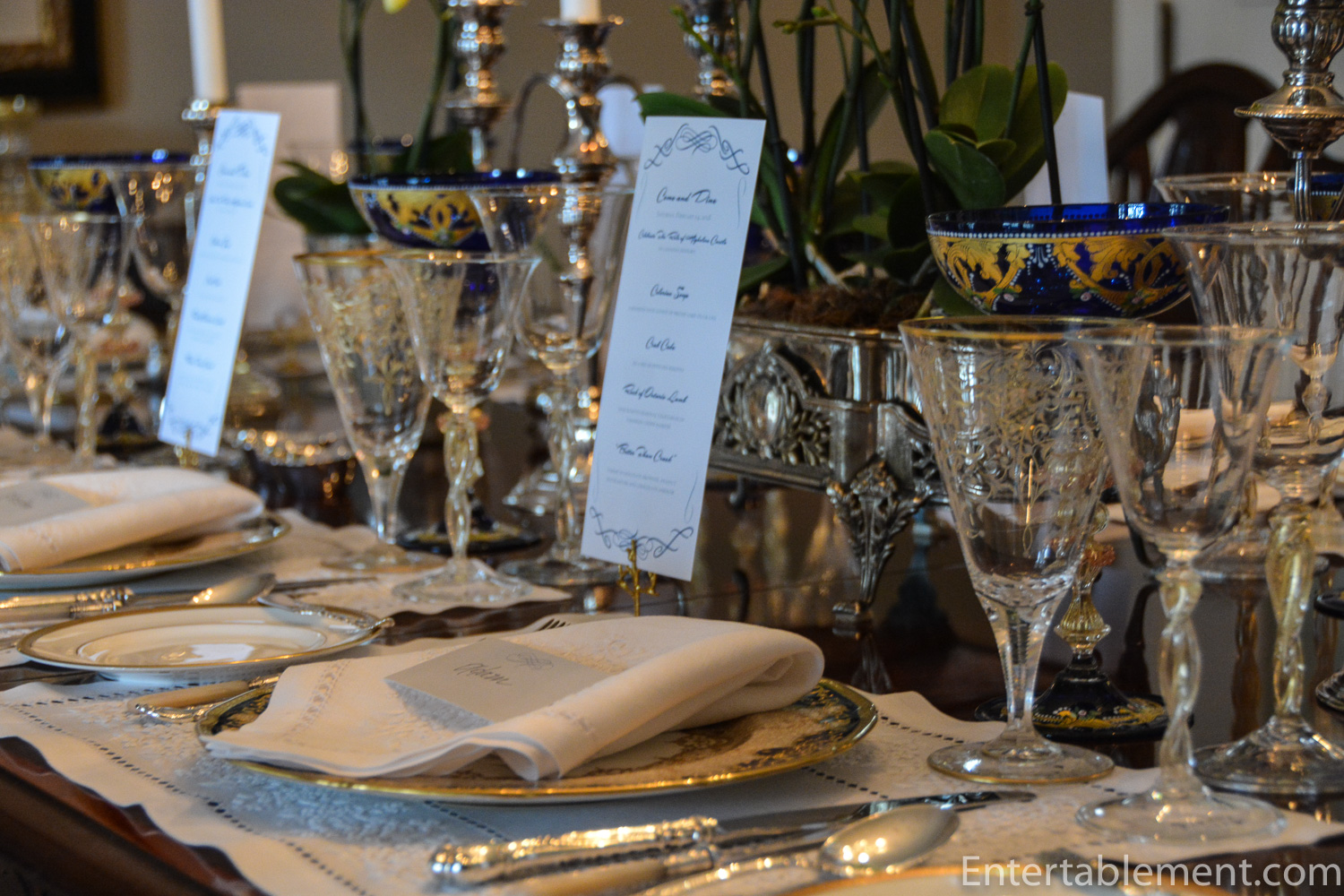 The antique gilded Moser water glasses remained filled throughout the dinner to offset some of the wine! I had debated using the coordinating Moser red and white wine glasses, but it seemed like Gilded Overkill, so went with the Venetian twisted stem goblets instead.