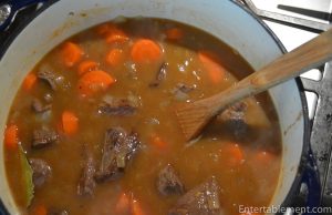 This hearty one-pot stew is traditionally made with lamb, but is every bit as good with beef. The layer of potatoes forms a delicious crisp crust atop a mixture of beef, carrots and onions in a silky thick gravy. Just the ticket for cold nights. Serve with a side of petit peas, steamed broccoli or winter salad along with crusty bread to sop up the gravy.