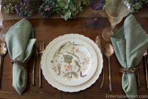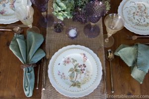 The napkins are Chambray Green by Pier 1; I liked the way the blanket stitch edge coordinated with the border on the dessert plates. Grapevine napkin rings seemed the ideal accompaniment to a nature-inspired table.