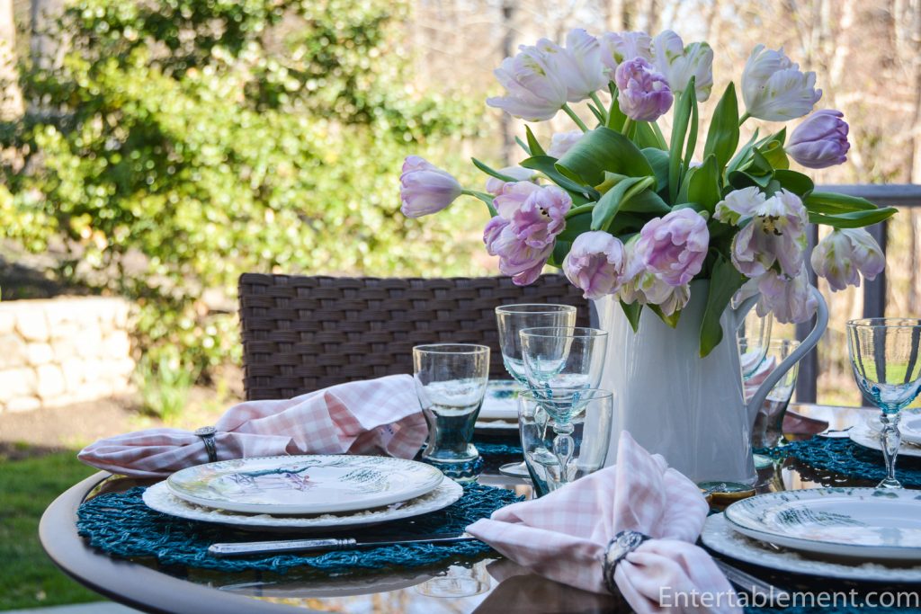 Now I feel like it’s really spring. The soft tones of pink and aqua on your table are so serene. We used to have these tulips but the rabbits have widdled the amount of plants down to one which we have protected with an ugly wire cage. Is it worth it? They are now working on our hostas. More wire cages. Ugh! The cream on cream plates are another “too pretty to use”. Better get this all in before the next rain. C U soon.