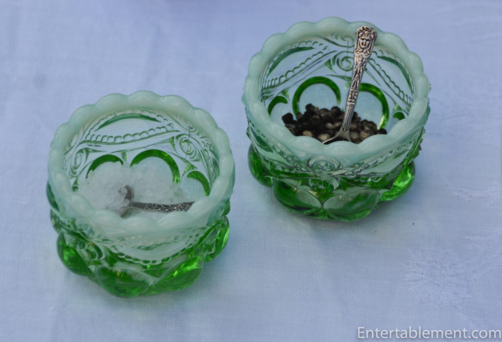 Opaline Salt Dips from The Source Collection echoed the delicate green border.