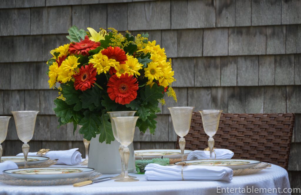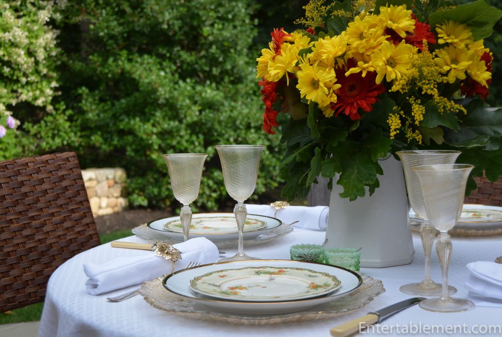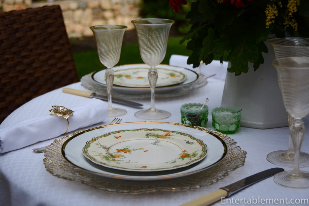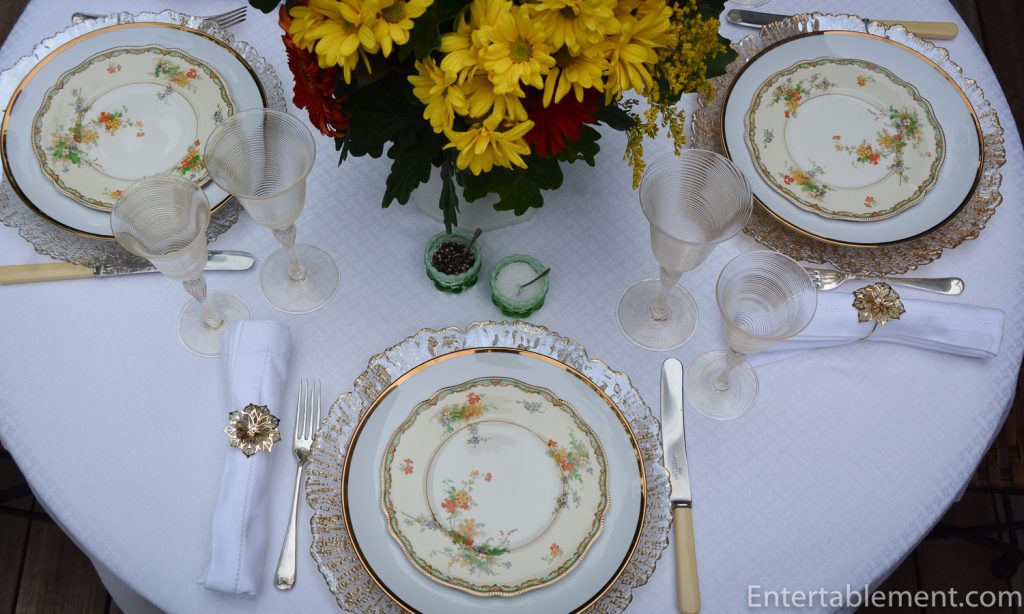 The canvas: a plain white tablecloth. Gold Luster charger plates topped with gold rimmed dinner plates (discontinued) from Pier 1 set the background.
