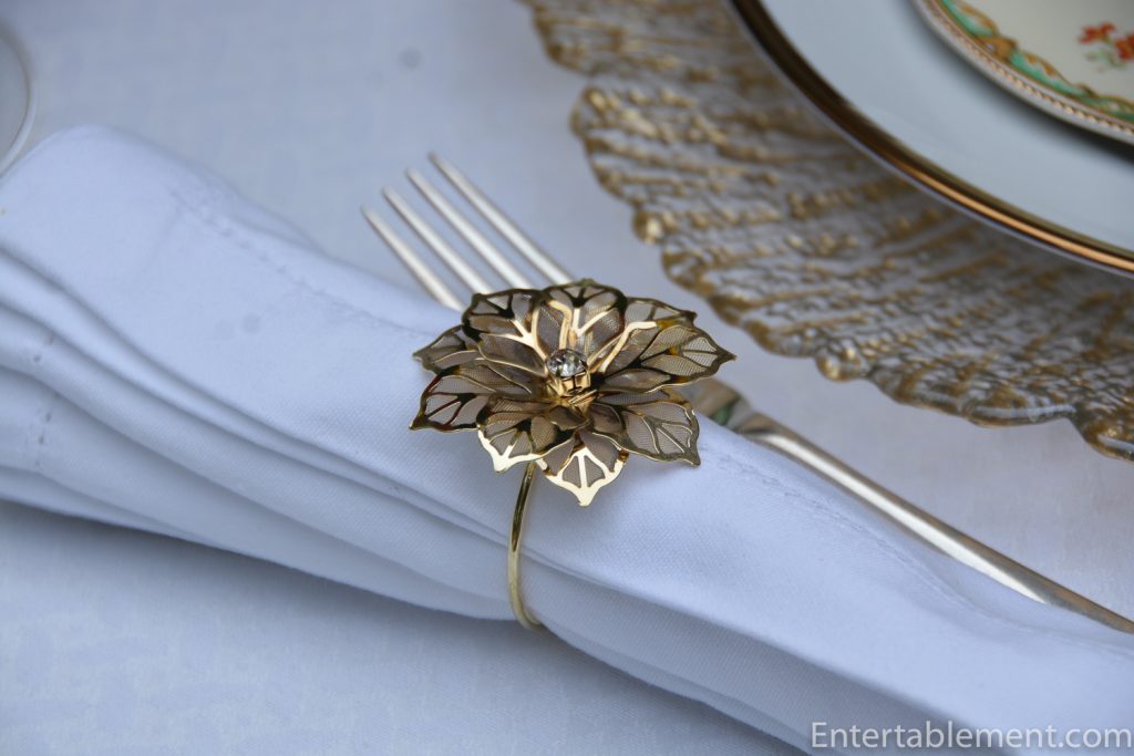 Gold flower napkin rings from Amazon added a layer of interest on the neatly rolled white napkin. A little restrained and buttoned up, the linens reflect the sparseness of the floral sprays.