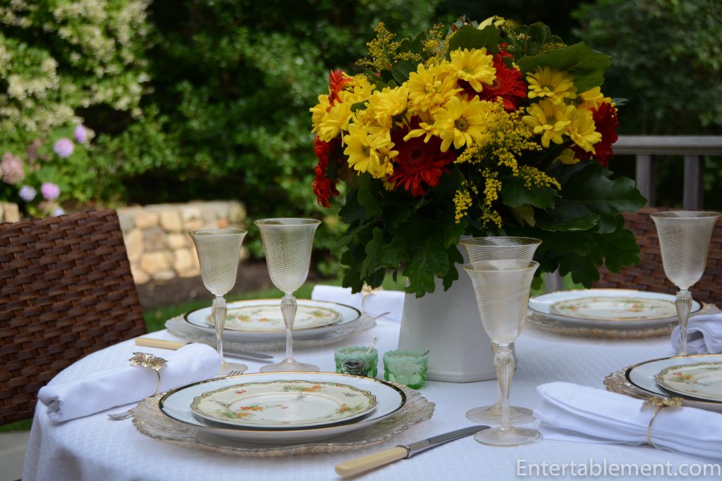 What a restrained yet cheerful table, with the vibrant yellows and red-orange in the plates. Picking up the minty tones helps balance them nicely. Helen, hope you are feeling better and will enjoy this dinner outdoors in a lovely setting.