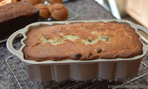 - Spoon batter into the loaf pan and bake for one hour, or until a toothpick inserted into the centre of the loaf comes out clean. Let cool in pan for 10 minutes; remove to a wire rack and let cool completely.