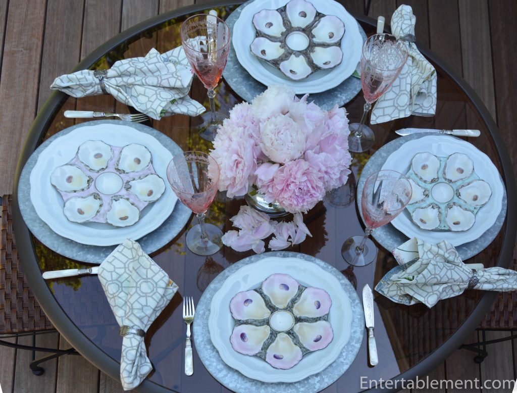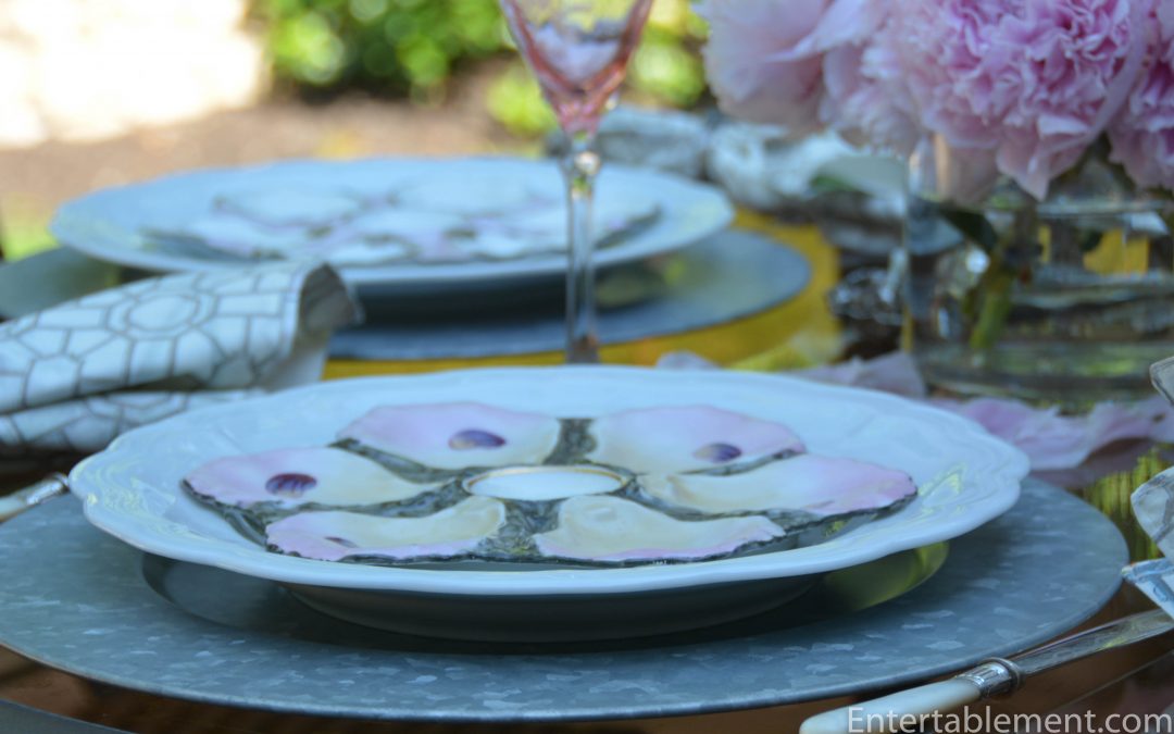 Having lived, on and off, near or on the Chesapeake Bay I am very familiar with oysters as well as the plates and other collectibles associated with oysters. Yours are particularly lovely, set off by the peonies, June goblets, mother-of-pearl fish set, and charming oyster salts. But is your use of the galvanized chargers that makes the whole setting particularly appealing. You have such a talent for combining the commonplace with the extraordinary.