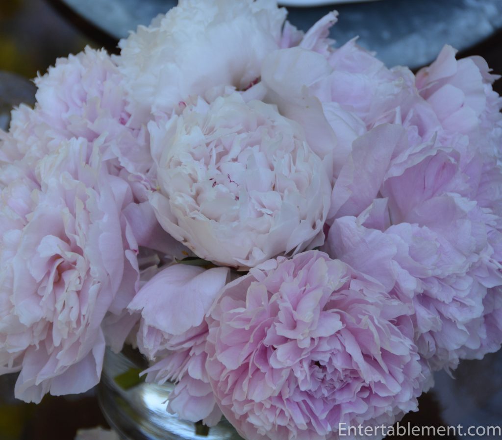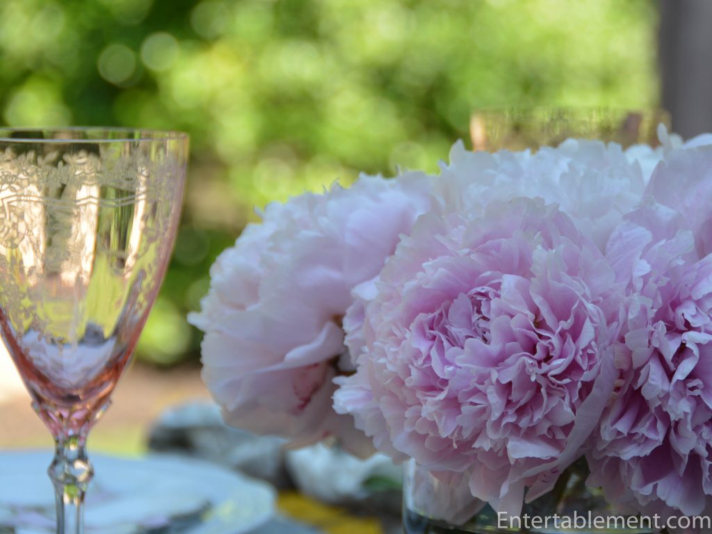 The peonies were blooming, and the soft pink shades of Sarah Bernhard called to mind the similar tones of the oyster plates, and the delicate hue of the Fostoria’s June Pink Depression Glass.