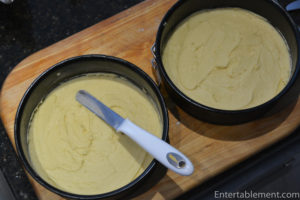 - Divide the batter between the two cake pans, smoothing the tops evenly with an offset spatula.