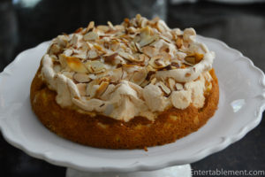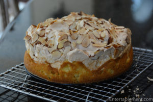 - Divide the meringue between the cake pans and spread with the back of a spoon to cover most of the cake, but leaving about 1/2″ from the edge of the pan uncovered; do not smooth the tops. Sprinkle the almonds over the meringue, and then bake until puffed and lightly browned (about 25 minutes). Let the layers cool in their pans on a rack; the tops will sink considerably.