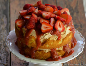 - 2 oz (about 1/2 c) fresh strawberries, sliced, for the top of the cake