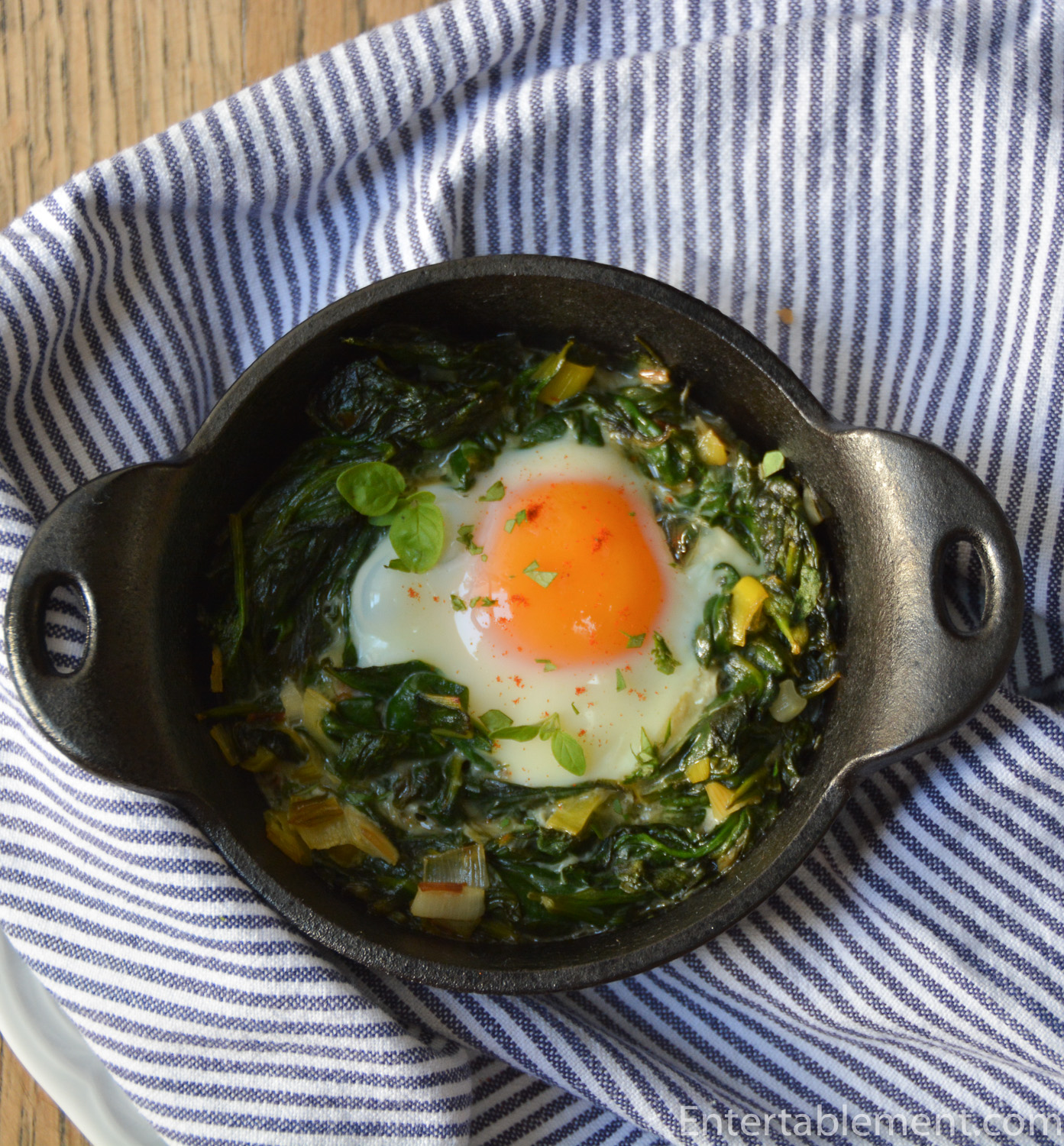 - Transfer spinach mixture to two small cast-iron skillets or one 8″ skillet, leaving any excess liquid behind. Make a deep indentation in each small skillet, or two in the larger skillet. Carefully break 1 egg into each hollow, taking care to keep yolks intact. Bake until egg whites are set, 10–15 minutes.