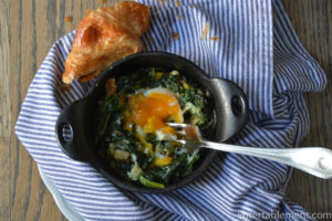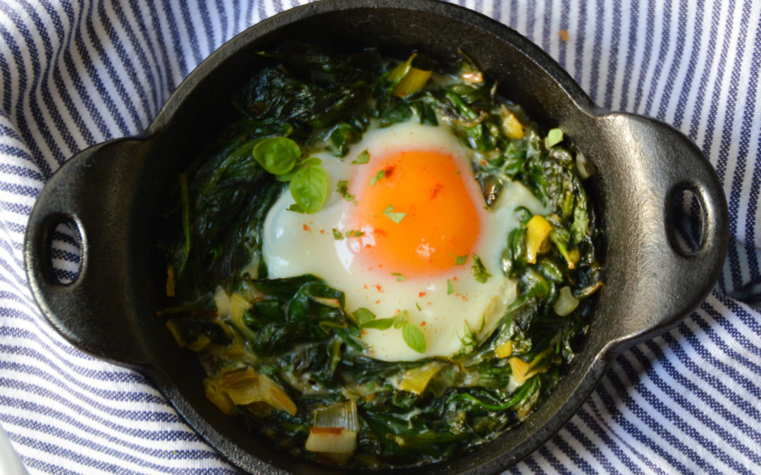 Delectable baked eggs on melted leeks and sauteed fresh spinach. Perfect for a healthy brunch, and allows the indulgence of a croissant on the side!