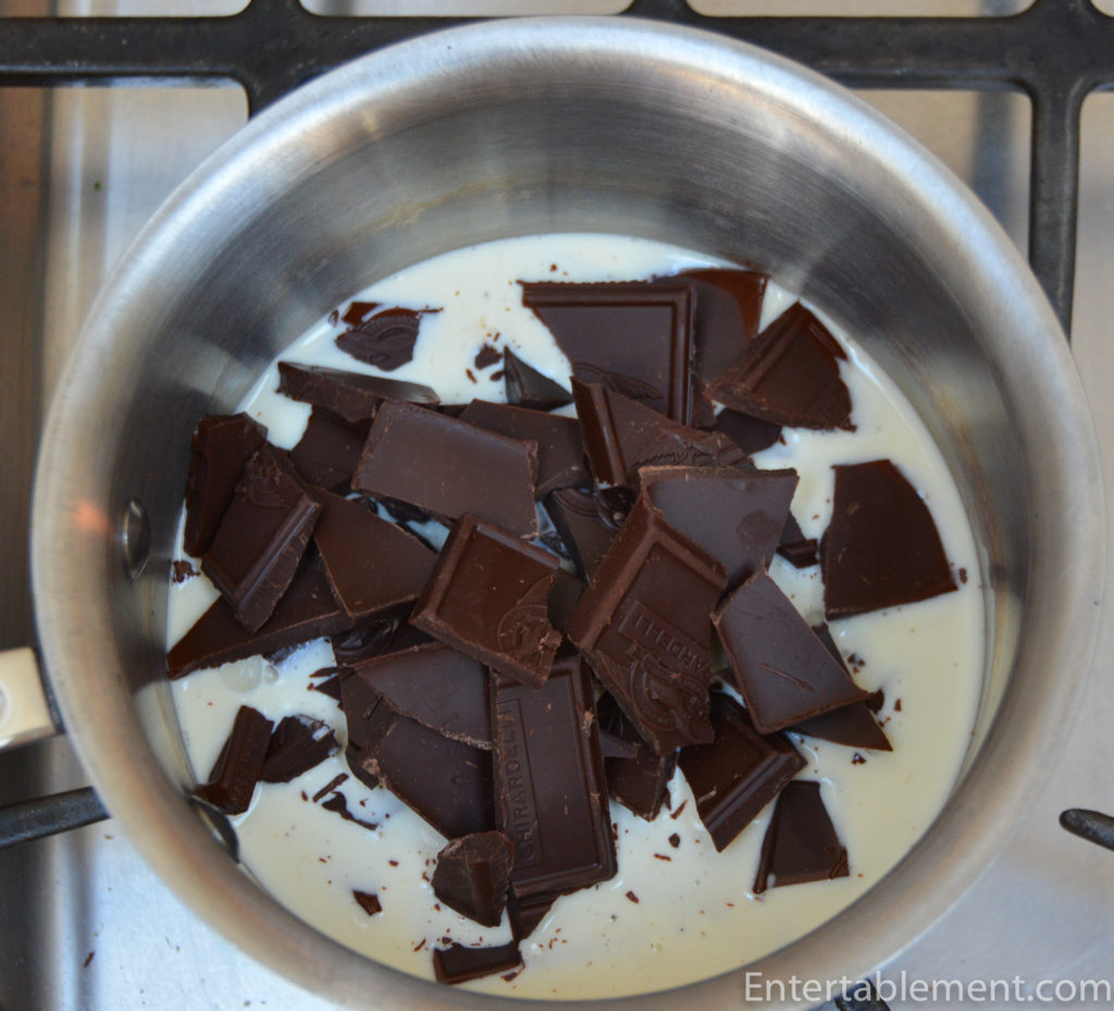 - In a medium saucepan, combine ½ c or 120 g of whipping cream and the chocolate. Heat gently over medium-low heat until the chocolate is melted and the mixture is smooth. Remove from the heat and stir in another 360 g or 1 ½ c of whipping cream; stir until thoroughly combined.