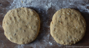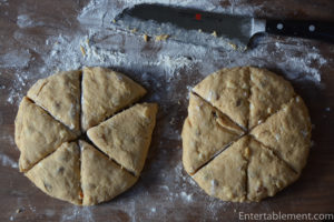 - Using a knife or bench knife that you’ve dipped into flour, slice each circle into 6 wedges.