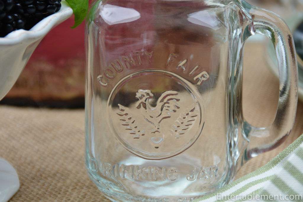 Happily crowing away on the handled mason jar glasses from Pottery Barn, many moons ago. (After spending several weeks of concentrated time with granddaughters, it seems I automatically start playing Where’s Waldo?).