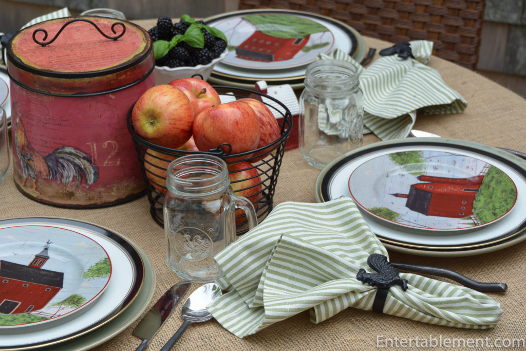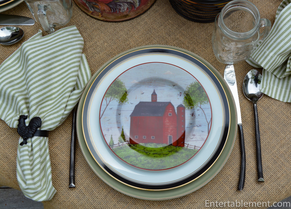 We have another rooster, on the Farmhouse Napkin rings, also from Amazon. The napkins are Wheaton Stripe in Cactus Green by Pottery Barn.