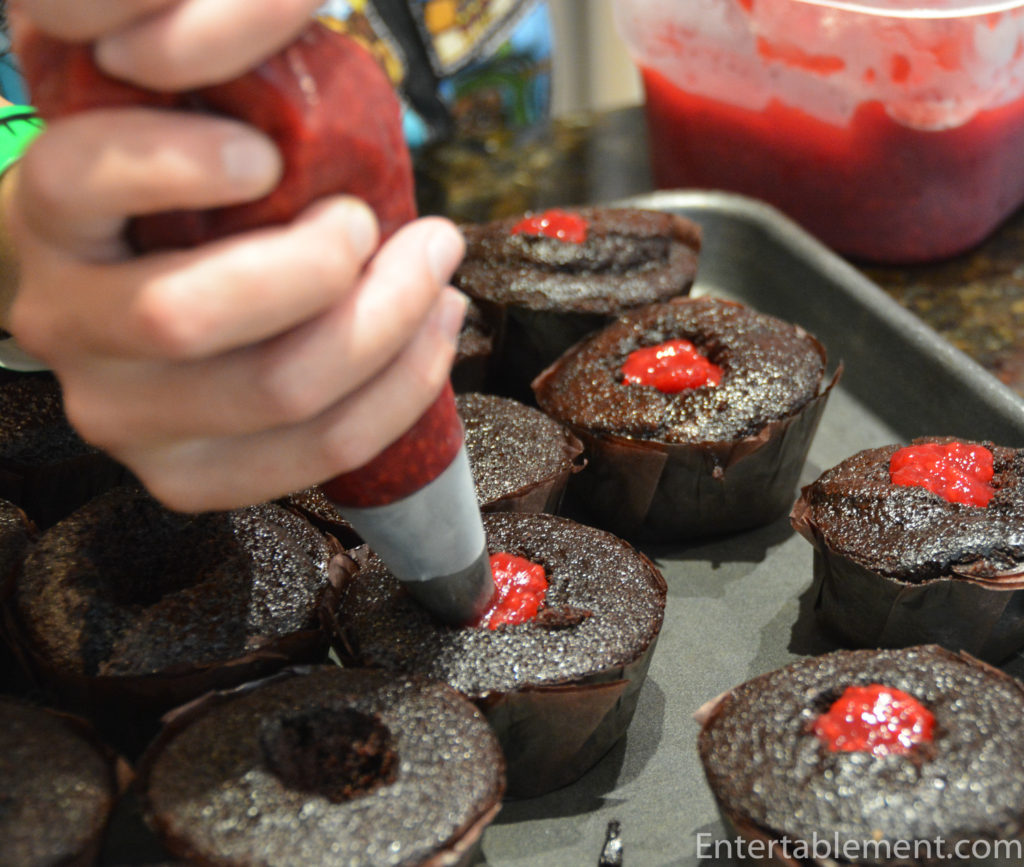We added about half a cup of the raspberry filling to the remaining half batch of buttercream to frost the filled cupcakes.