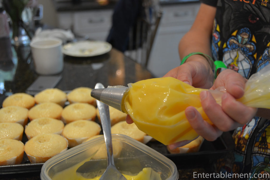 Saturday morning, we started with the vanilla cupcakes, cutting holes in half of them to accommodate the filling. Lauren showed me an elegant trick for the piping bag. Once the tip was inserted into the end of the bag, she shoved a portion of the bag into the inside of the tip to prevent the contents from leaking while we attended to other things.