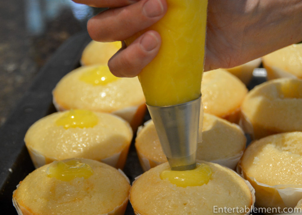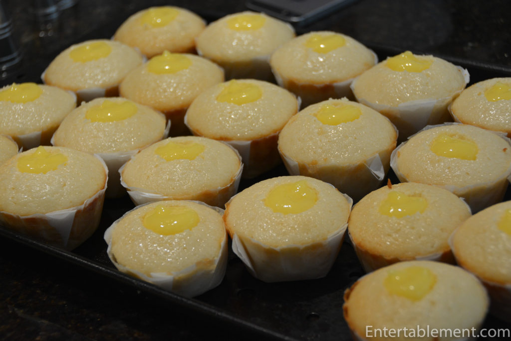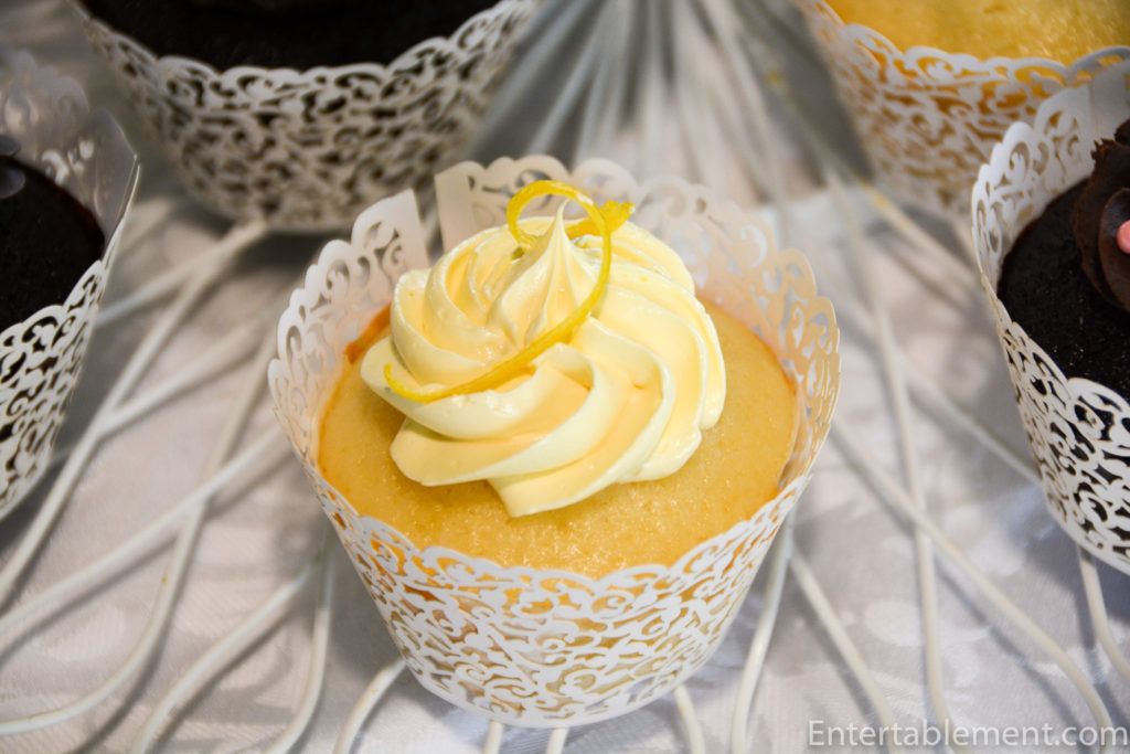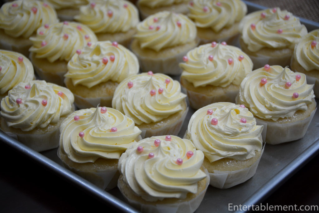 It took a batch and a half of the French Buttercream to do the 48 Vanilla and Lemon Curd Filled Cupcakes. We reserved half of the second batch for the raspberry-filled chocolate. We cut holes in half the chocolate cupcakes. I had used Lotus Flower cupcake liners, but we decided the wings were too messy, so I clipped them all down to cupcake level with a pair of manicure scissors.