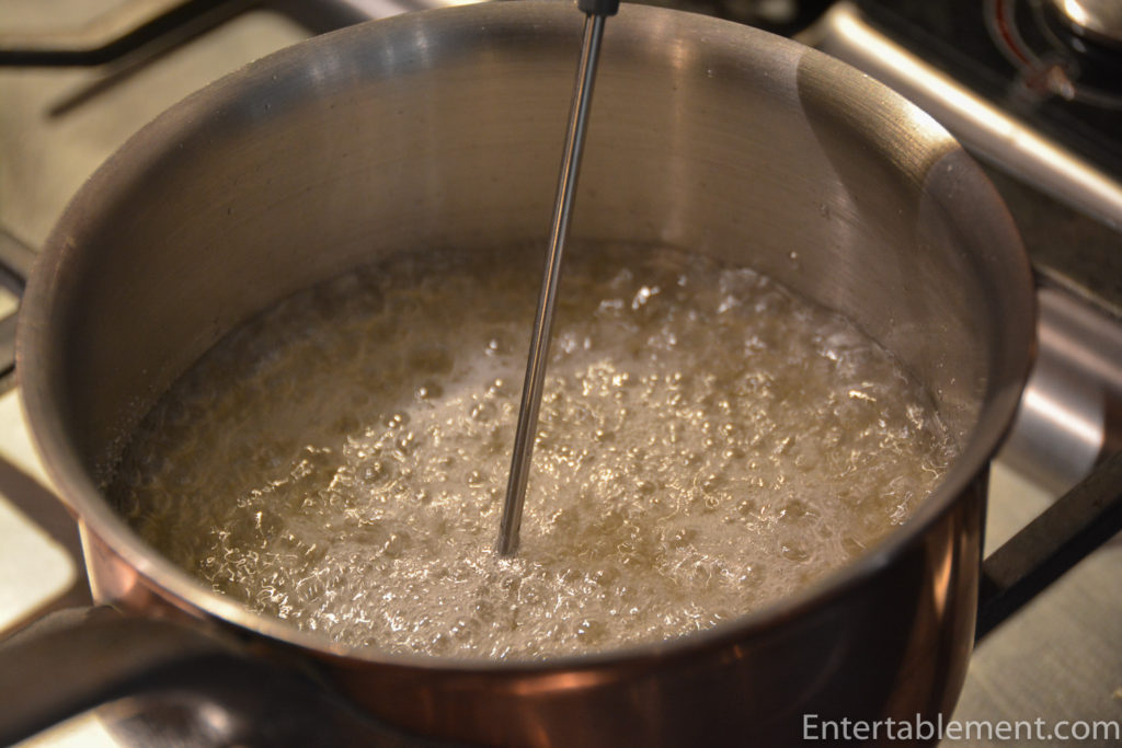 She boiled the sugar and water in a small pot on the stove until it reached 115°C.
